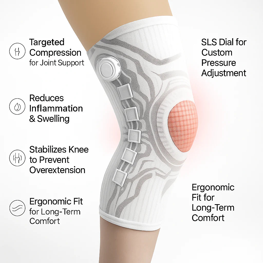The Kuangmi™ Smart Knee Brace is a next-generation solution for knee pain, injuries, and instability. Engineered with cutting-edge technology, it offers superior comfort, support, and ease of use compared to traditional braces. - Unlike Velcro straps or elastic bands, the SLS Technology provides micro-adjustable, precision support with a simple dial.